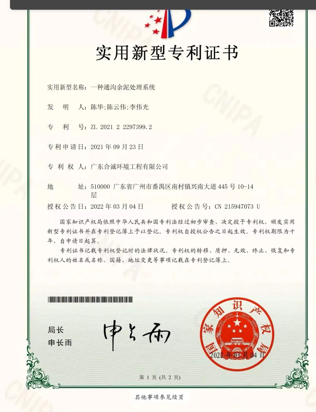 同時該項工藝還獲得了國家知識產(chǎn)權(quán)局認證的實用新型專利。至此,合誠環(huán)境集團已經(jīng)擁有數(shù)十項專利證書。