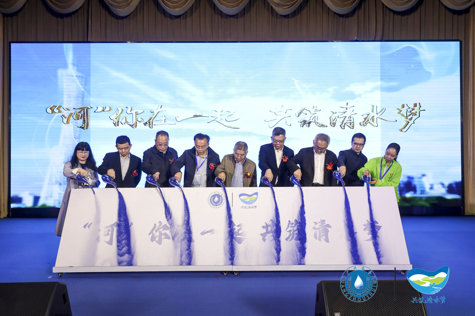 象征清水的藍(lán)色砂粒在與會領(lǐng)導(dǎo)嘉賓同民間河長代表共同見證下被緩緩倒進(jìn)展示槽,“河你在一起、共筑清水夢”字樣逐漸顯示。全民治水主題宣傳活動就此拉開序幕,廣州全民治水事業(yè)正站在新的起點(diǎn)上再出發(fā)。