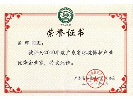 廣東省環(huán)境保護產(chǎn)業(yè)優(yōu)秀企業(yè)家